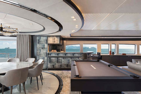 Meals can be enjoyed al fresco to aft on the main deck, within the saloon, or at the formal dining table on the bridge deck, which resides within an innovative circular space with glass doors connecting it to both the interior and exterior.