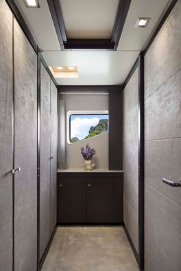 There’s accommodation for 10 guests in five spacious cabins, comprising four doubles and one twin. The full-beam master suite benefits from an owner’s study, walk-in wardrobe, and full en suite with statement bathtub. Each cabin is finished to fantastic standards.